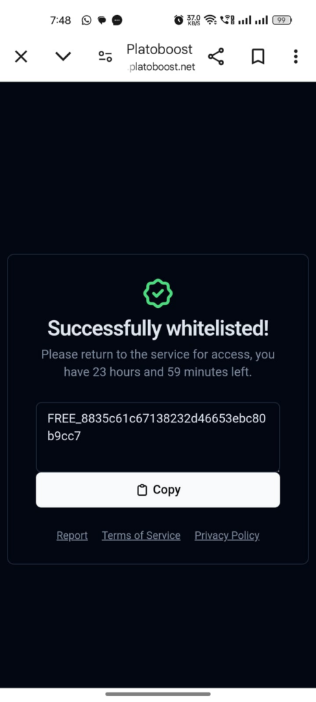 Copy the key, return to Roblox, paste it, and tap Continue.